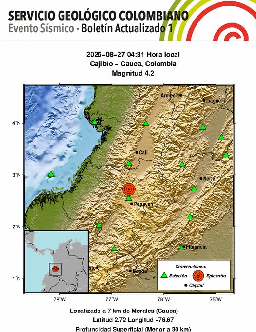 En la madrugada de este miércoles 27 de agosto, un sismo de magnitud 4,2 sorprendió a los habitantes del suroccidente del país. El epicentro se localizó en Cajibío, Cauca, a menos de 30 km de profundidad, según el Servicio Geológico Colombiano.